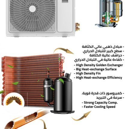 يعمل بصوت هادئ، ريش ذهبية مقاومة للتآكل، وغاز R410a الصديق للبيئة لضمان تبريد مستدام واقتصادي للطاقة.